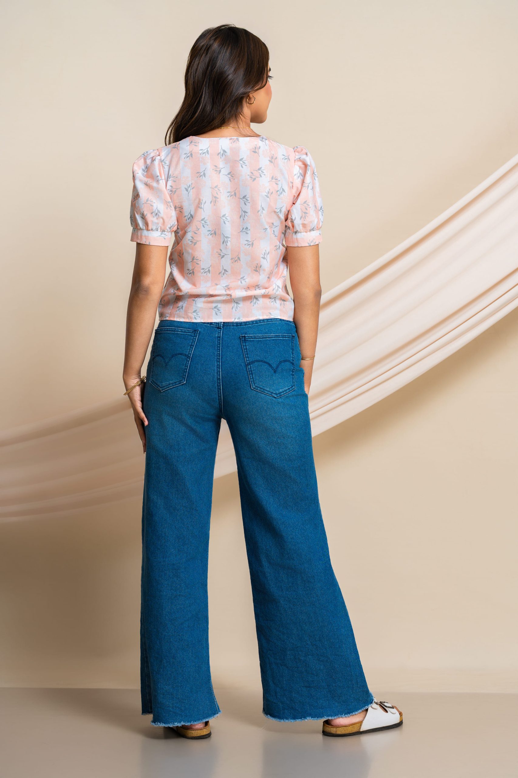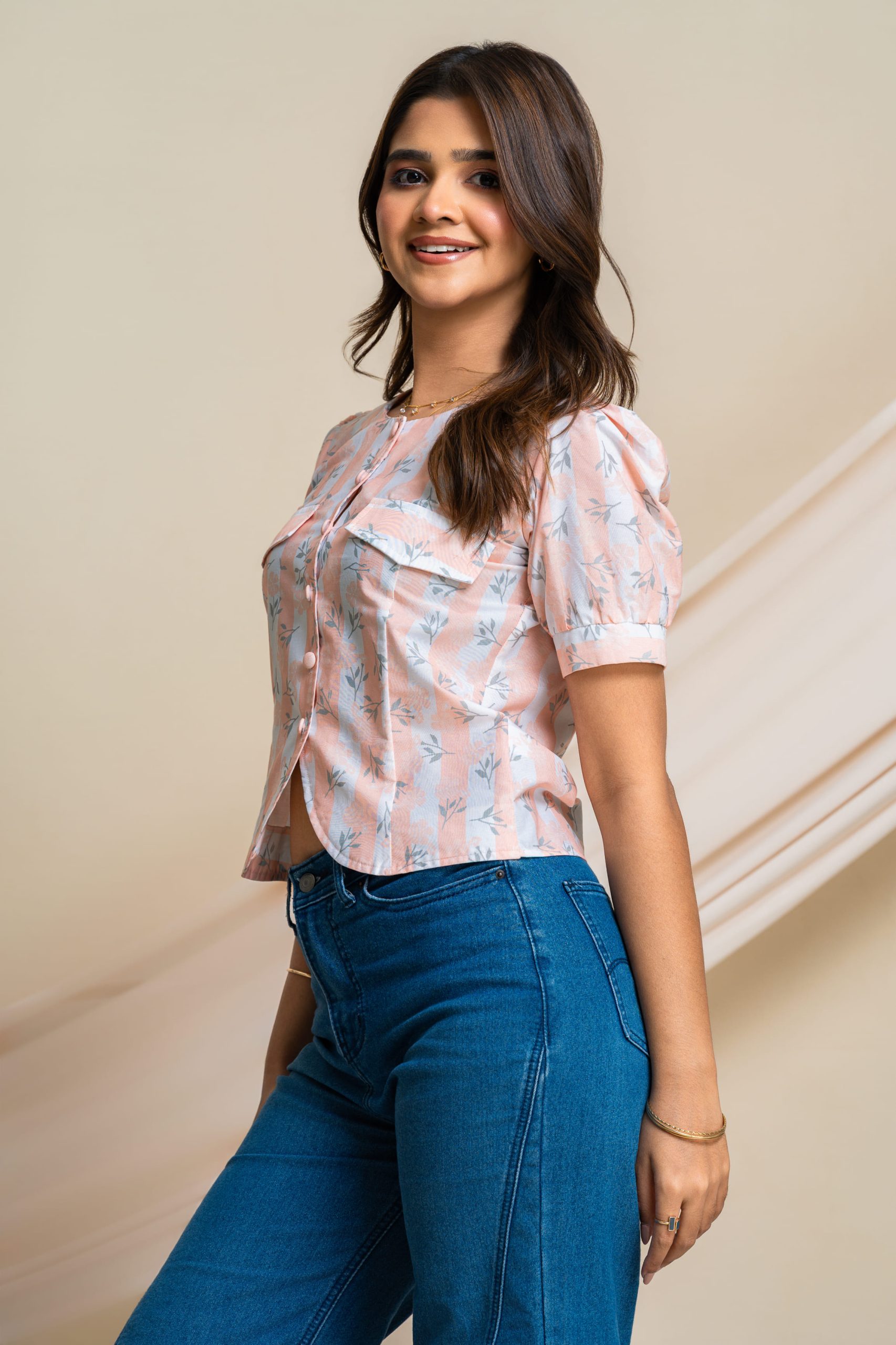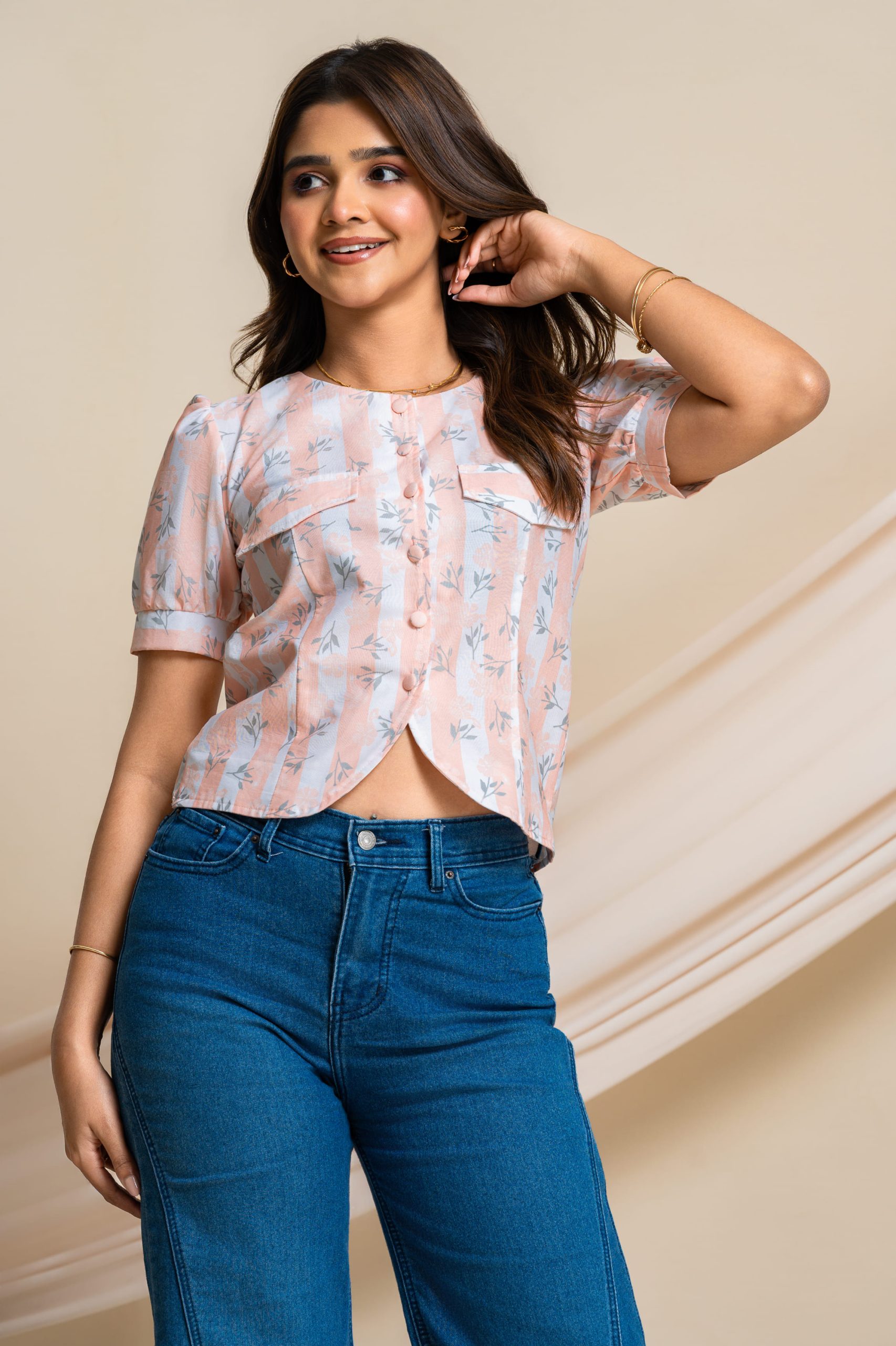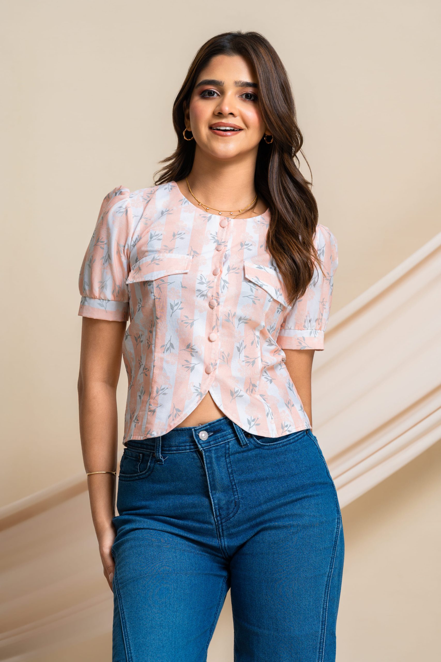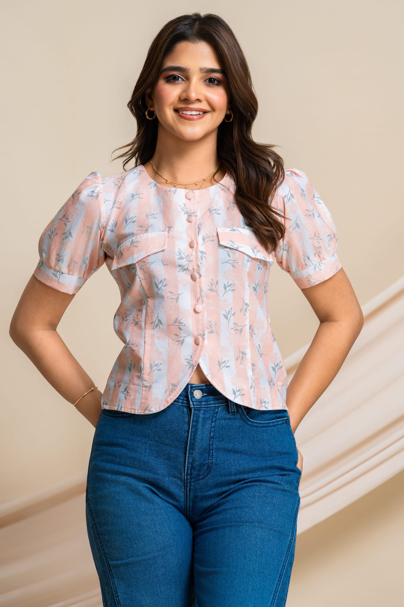 • Soft peach print for a fresh, playful look
